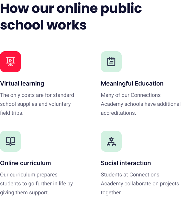 Discover best classes for the best learning We designed Connections Academy to give students all across the nation a tuition-free online public school that lets them learn. Get Started Not sure when to start? Learn more